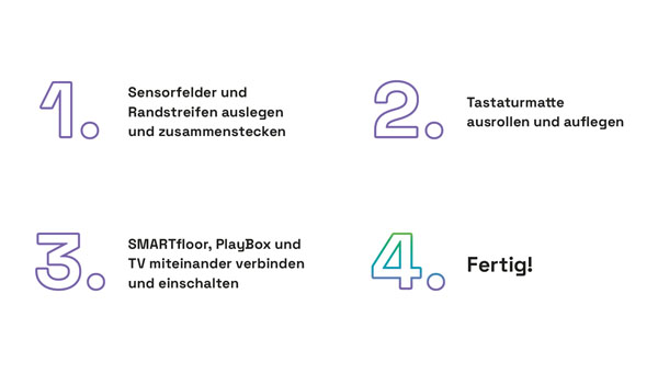 | | | | SMARTfloor Puzzle besteht aus Sensorfeldern und Randstreifen. Die quadratischen Sensorfelder lassen sich an ihren Verzahnungen flexibel zusammenfügen, während die Randstreifen als Abschluss das Gesamtbild abrunden. Für das optimale Spielerlebnis bietet SMARTfloor Puzzle verschiedene Tastaturmatten in unterschiedlichen Designs. Auch bei der Wahl des Anzeigegeräts für Spiele und Apps bietet SMARTfloor Puzzle größtmögliche Flexibilität: Ob TV, Beamer oder Monitor, jedes HDMI-fähige Gerät ist problemlos nutzbar. Bisher erhältlich als 4-er und 16-er Set, wobei man aber grundsätzlich frei in der Form und Anzahl der Felder ist und somit maximale Flexibilität für jegliche örtlichen Gegebenheiten erhält.